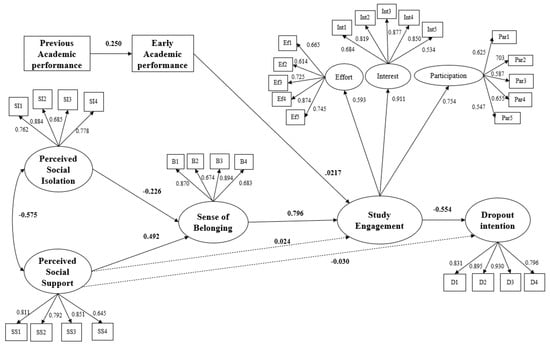 The standardized beta values of the model show significant values in most of the relationships proposed between the variables, except for the routes that include the direct influence of perceived social support on study engagement (β = 0.024, p > 0.05) and on dropout intention (β = −0.030, p > 0.05). For the other relationships, the observed standardized beta values were significant and fluctuated between moderate and strong values (β = 0.217 β = −0.796, p < 0.01). The initial model is shown in Figure 2.