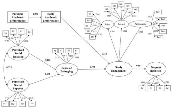 Both support and social isolation have shown their importance in university studies due to their impact on social integration of students and the consequences of this on mental health and the networks available to advance in academic activities [35,36], in addition to being directly related to lower dropout rates [37]. Therefore, the greater the social integration, the lower the probability of drop out, where social integration is being affected by both social support and social isolation.
