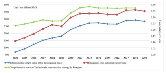Table 4 shows the calculated comprehensive scores for industrial concentration in Shanghai. Overall, from 2004 to 2018, the comprehensive scores of the industrial concentration in Shanghai exhibited an obvious upward trend, indicating that Shanghai’s industrial centralization strategy has achieved good results. From 2004 to 2013, after the governance and rectification of the development zones, Shanghai’s industrial activity as a whole concentrated in each development zone. After 2013, industrial concentration tended to level off. In addition, the comprehensive score decreased from 2008 to 2009, indicating that the output level and investment intensity of Shanghai development zones were affected by the global financial crisis and that temporary fluctuations occurred.