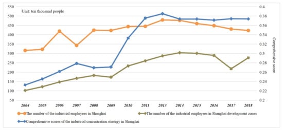 With the promotion of the industrial concentration strategy, the number of industrial employees in the development zones increased from 1.02 million in 2004 to 3.04 million in 2014, reflecting an increase of 198%. In the same period, the industrial employees in Shanghai rose from 3.16 million to 4.77 million, showing an obvious growth trend (Figure 4). Since 2014, the industrial concentration degree of Shanghai has increased significantly, the number of industrial employees in Shanghai and Shanghai development zones has also decreased year by year. Therefore, it can be concluded that industrial concentration can increase employment capacity.