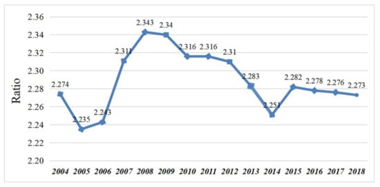 The results of this article show that (1) from 2005 to 2012, the Gini coefficient showed a decreasing trend on the whole, indicating that the regional differences of per capita GDP in the suburbs of Shanghai tended to narrow. However, from 2013 to 2015, the regional differences of per capita GDP showed an increasing trend. The main reasons for the widening gap between urban and rural areas in this period are as follows: first, the general public budget revenue of the inner suburbs is obviously higher than that of the outer suburbs. Second, in the same district, the development of ecological water conservation area lags behind other areas. Third, the construction of urban and rural social security system is not coordinated and synchronized, and farmers not only receive a lower initial distribution but also find it difficult to receive more benefit compensation in the redistribution. Fourth, a large number of migrant population swarmed into the suburbs of Shanghai, affecting the non-agricultural employment opportunities and incomes of local farmers. From 2016 to 2018, the Shanghai municipal government has made great efforts to promote the integration of urban and rural development and has issued 21 supporting policies, while the Gini coefficient showed a slight decrease year by year again (Figure 6). (2) From 2004 to 2018, the difference of per capita disposable income between urban and rural areas in Shanghai showed a trend of “shrinking-expanding-shrinking-expanding-shrinking”; especially since 2008, the overall change trend has been shrinking (Figure 7). It shows that at the suburban level, the strategy of industrial concentration in the suburbs of Shanghai has narrowed the gap of economic development among the suburbs to some extent and promoted the relatively balanced allocation of industrial agglomeration areas in the suburbs; at a citywide level, restricted by the cyclical law of economic development, the evolution of the urban-rural gap in Shanghai does not show a stable narrowing trend, but shows a pattern of cyclical changes. In addition, this is also closely related to the government’s phased economic regulation and control policies.