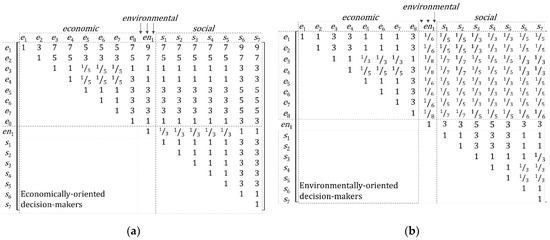 An example of a sub-criteria judgment matrix from Serbia: (a) Economically oriented decision-maker; (b) Environmentally oriented decision-maker.