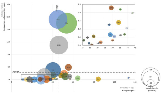 European CDW generation rates in relation to GPD per capita (data for 2018). (ISO-3166-Aplha 3-digit codes were used for countries abbreviations).