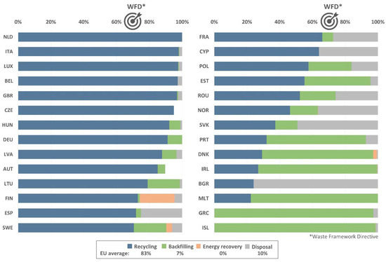 The EU countries, Slovenia and Croatia, have high recycling rates due to the recovery targets from the WFD. The Slovenian landfilling tax of EUR 11 and 22 per ton of non-hazardous and hazardous waste, respectively [60], may show the efficiency of tax as an economic instrument for increased recycling and recovery (98%). However, the share of high-quality application of these recycled materials is still in question.