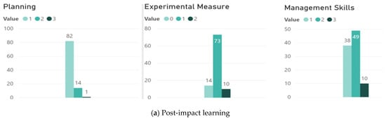 - Learning tools variable: The indicators included (1) post-impact; (2) transformational learning (Figure 7). Overall, the post-impact learning quite diverged among residents. For assessing the planning, experimental measures, and management skills, 69 respondents felt associated with the planning, with 63 respondents feeling a correlation with experimental measures; only 48 respondents felt management skills were crucial within the post-impact learning. For transformational learning, only 45 respondents felt they could identify the problem, but 69 respondents felt reasonably familiar with the habitat and human domain system; 52 respondents felt they were capable of identifying and redefining from each event, which accounted for 53% of the qualified respondents.