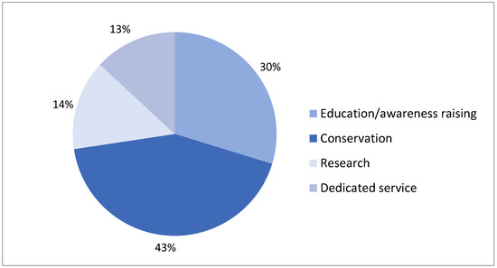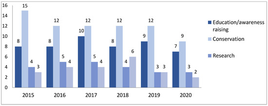 In the past six years (2015–2020) Europa Nostra awarded most awards (72) in the category of conservation (Figure 1), with education and awareness raising following at quite a distance (50 awards). This may suggest that conservation efforts are a prevailing and dominant practice, with presumably the largest number of nominations. This focus on conservation also suggests it to be the heritage practice that is valued most by the awarding organisation. It may also mean the heritage domain has been most successful in developing best practices in conservation, as this has been a focal point of heritage practices since the ICOMOS Venice Charter was introduced in 1964 as a guideline for good practice for restoring monuments and sites [18]. Perhaps it even reflects that defining and acknowledging good practices is easier or more straightforward for working with material than working with people (e.g., in education). We can however see a slightly decreasing dominance of this focus on conservation across the years (Figure 2), with 2020 being an anomaly, as the number of awards was much smaller in this period (possibly due to the COVID-19 pandemic).
