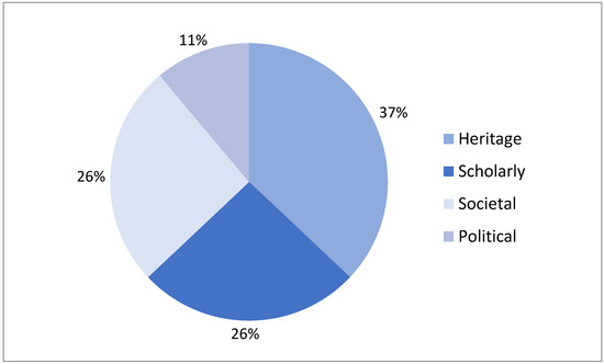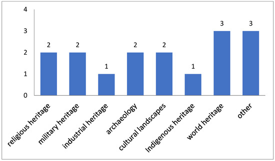 For the EAA Heritage Prize, the division of tangible and intangible seems unreasonable due to the recognition of the EAA jury that both tangible and intangible heritage are deeply interconnected and co-dependent. As Laurajane Smith declared, all heritage is subject to a process of cultural production and always contains an intangible component [19]. Yet, since archaeology mostly deals with material culture, and the focus seems to be on preservation or protection of tangible remains, the EAA Heritage Prizes can be categorized in only tangible heritage. However, they are subdivided into cultural landscape, archaeological, military, industrial, religious, and Indigenous heritage (Figure 5). A few winners showed an overlap. Three are also listed as World Heritage Sites. Three prizes were categorized as other since they did not specifically mention a type of heritage.