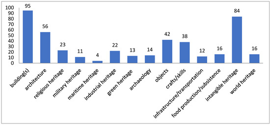 By examining the Europa Nostra Awards, we found that there is a wide variety of types of heritage represented in the awarded practices (Figure 4). Providing a distinctive categorization is a challenge, however, as many heritage projects relate to more than one type of heritage. We based the classification therefore on characterizations provided by the nomination texts, instead of on our own predefined categories, and classified most projects in multiple categories. Built heritage, consisting of historic buildings (and the subcategory of architecture) clearly stand out as a main category. It was followed by the category of intangible heritage, for which it was observed that quite a large part was connected with built heritage. Only just over half (56%) of this category of intangible heritage—47 awarded practices—related to intangible heritage exclusively. There is thus clearly less attention for intangible forms of heritage if it is not connected with built heritage.