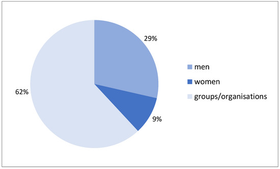From 2015 to 2020 the Europa Nostra awards for dedicated services (21) consisted of eight individuals and 13 organisations (Figure 9). Only two of these individuals were women (25%). In total, 29 per cent of the awards went to men, 9 per cent to women.