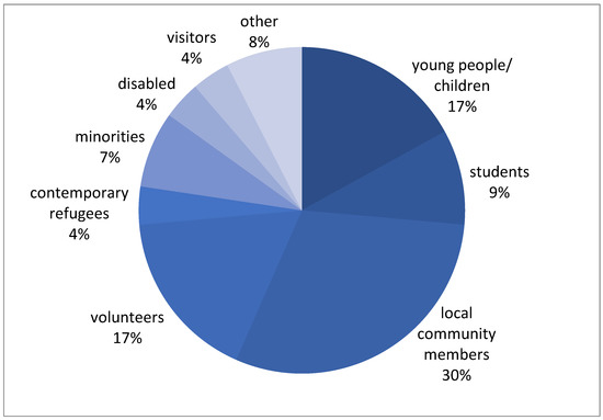For both prizes we analysed if the awarded practices addressed specific target audiences and in case of societal engagement, to whom this engagement was directed. In the Europa Nostra Awards, less than a third (29%) of the best practices explicitly mentioned a specific social group that was meant to benefit from the heritage project. The local community was mentioned most, followed by young people (children and students) and volunteers (Figure 10). This illustrates the importance of the social dimension of these heritage practices. What is, however, striking, is that there seems to be a discrepancy between those we can call insiders and outsiders in terms of opportunities to be included. Marginalized groups (defined as ‘Different groups of people within a given culture, context and history at risk of being subjected to multiple discrimination due to the interplay of different personal characteristics or grounds, such as sex, gender, age, ethnicity, religion or belief, health status, disability, sexual orientation, gender identity, education or income, or living in various geographic localities’ by the European Institute of Gender Equality), who for whatever reason are less or not involved in mainstream economic, political, cultural and social activities, are hardly mentioned as specifically targeted groups. Of all 168 best practices awarded between 2015 and 2020, only two were stated to be explicitly or exclusively directed toward people with disabilities and another two toward (contemporary) refugees. (Ethnic) Minority groups figured in four other projects.