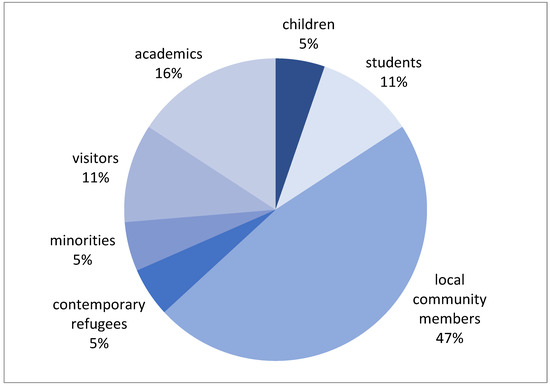 Unlike the Europa Nostra Awards, nine out of the 11 best practices highlighted by the EAA award mention specific target audiences who have been engaged or who benefit from their practices (Figure 11). The local community was mentioned in 47 per cent of these cases, followed by academics (16%) and students and visitors (each 11%). None of the best practices mentioned the inclusion of people with disabilities, while the target group “minorities” (mentioned once) refers to ethnic minorities.