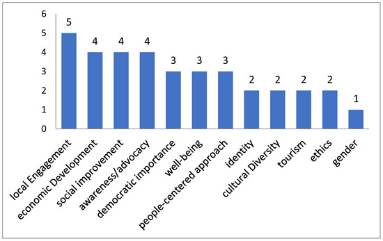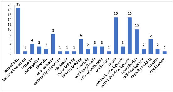 For a considerable number of 74 (44%) of the Europa Nostra awards an explicit societal aim was mentioned, with a large variety of aims that could be placed under the ‘social component’ of the Council of Europe’s Cultural Heritage Strategy for the 21st Century [4]. Among these, accessibility is mentioned most (Figure 12), although not in relation to specific target groups such as disabled persons (as was discussed above). These figures also show a limited amount of attention to improving diversity and well-being. Half of the aims mentioned refer to the Council’s economic development component. It is striking that re-use of heritage and revitalizing regions are important aims, while tourism seems to have become subordinate. Employment is not mentioned often either, but it may be considered part of sustainable development and capacity building.