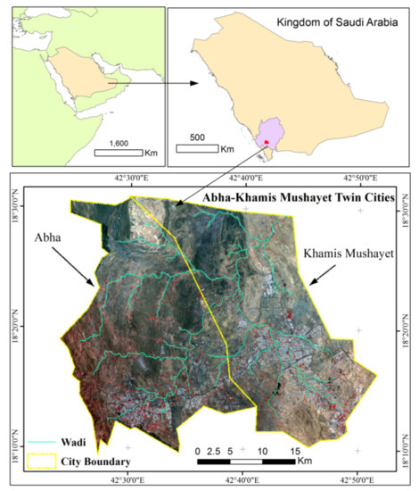 The twin cities of Abha-Khamis Mushayet (Figure 2) in Saudi Arabia’s south-western province were chosen for this research. The urban high hills are a popular tourist destination with the most diverse flora and fauna in the Asir region and Saudi Arabia [49]. The study site covers a total area of 1291 km2 and is dominated by “J. procera trees, Acacia origena and A. gerrardii”. The boundary of the Abha-Khamis Mushayet twin cities extends between the latitude of 18°9′33.126″ N to 18°30′56.566″ N latitude and 42°23′52.477″ E to 42°51′42.832″ E longitude and the elevation ranges from 1557 m to 2743 m above sea level, with an average of 2102 m. During February to June months, the region is prone to heavy rain, and some of its neighbouring villages and rural areas have experienced flash floods.
