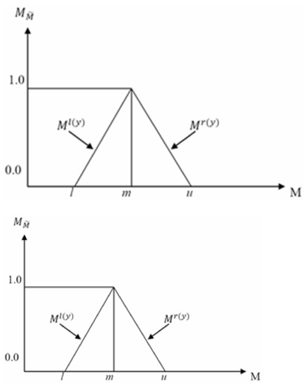 TFNs are expressed by (l/m, m/u) or (l, m, u), the lowest possible value, the highest possible value, respectively, the TFN has a linear representation on its right and left sides during its membership term (Equation (2)).