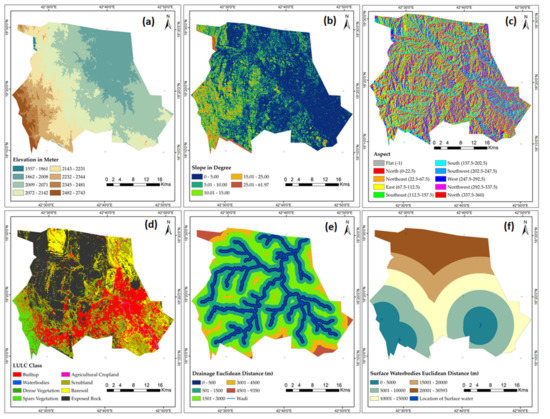 Geophysical Aspect (a) Elevation; (b) Slope; (c) Aspect; (d) LULC; (e) distance to draiange network; (f) distance to surface water) for safe site selection of residential building constrcution of Abha-Khamis Mushyet Cites.