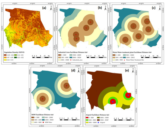 Geoenvironmental Aspect (a) Vegetation density; (b) distance to industrial area; (c) distance to waste waster treatment plant; (d) distance to municipal solid waste disposal; (e) distance to airport) for safe site selection of building construction of Abha-Khamis Mushyet Cites.