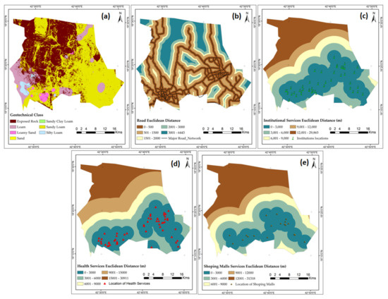 Socio Economic aspects (a) geotechnical properties; (b) distance to road network; (c) distance to institutional services; (d) distance to health services; (e) distance to shopping malls) for safe site selection of building construction of Abha-Khamis Mushyet Cites.