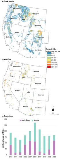 Cumulative CO2 emissions from biomass loss due to bark beetle (a) and wildfires (b) on western U.S. forests from 2003 to 2012 and total losses per disturbance type and year (c).