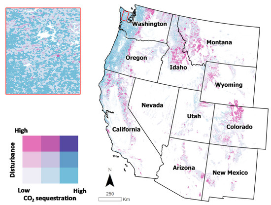 Fire and bark-beetle outbreaks have greatly impacted forest ecosystems in the study area (Figure 2). Only the Cascadia Bioregion in the Pacific Northwest area of Washington and Oregon has had high CO2 sequestration and low disturbance impacts. The temperate rainforests in this region host some of the tallest and oldest trees with the largest basal area in the world. The forest biomass per unit of area in this region is larger than the biomass in tropical and boreal forests [20]. In addition, this region has the greatest annual rainfall in all the U.S., which contributes to longer fire return intervals in this area [21,22]. Nevertheless, even in this region, there have been areas affected by significant disturbance levels that have reduced CO2 sequestration rates (inset map in Figure 2).