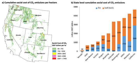 The spatial patterns of the SC-CO2 emissions from forest disturbances were determined by the frequency and intensity of the modelled forest stressors (Figure 3). On a per hectare basis, the cumulative social cost of forest disturbances associated with CO2 emissions from 2003 to 2012 ranged from USD 69 to USD 17,495 per hectare (2007 dollars)—assuming a 3% discount rate for future climate damage (Figure 3a). Over this same period, the cumulative SC-CO2 emissions were valued at about USD 25.8 billion, with 36% from tree biomass loss due to wildfires and 64% from bark-beetle damage (Figure 3b). Around 75% of this cost was due to forests’ disturbances in California, Montana, Idaho, Washington, and Colorado (Figure 3b). Average annual SC-CO2 emissions ranged from USD 11 million in Nevada to USD 469 million in California for a cumulative impact of USD 109 million and USD 4.7 billion in such states from 2003 to 2012 (Figure 3b).