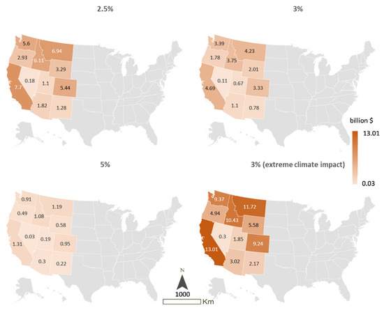 SC-CO2 emissions for trend climate-change impacts [16] indicate costs of USD 42 billion, USD 26 billion, and USD 7 billion at 2.5%, 3%, and 5% discount rates, respectively (Figure 4). The costs associated with extreme climate-change damage scenarios and a 3% discount rate would increase SC-CO2 emissions from wildfires and bark beetle to USD 72 billion.