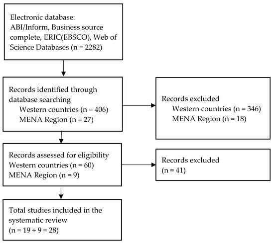 An inclusive approach would demand the inclusion of all 406 articles from Western countries for the review, but this way was deemed inefficient since I only had 9 articles from the MENA region to compare. Alternatively, I decided to adopt a statistical method to form a representative random sample from the 406 articles. To be 90% certain of being accurate to within +0.1 and −0.1 of the true proportion of all articles, a minimum sample size of 41 articles was needed from this region [22]. I increased the sample to 60 articles to lower the probability of Type II error. In the second step, I followed the inclusion criteria rules (Table 2). Initially, I reviewed only abstracts and skimmed the methodology section to determine relevancy of the articles and in the final step, reviewed the chosen one in depth. I reviewed articles that contained drivers of CSR in depth. A total of 19 articles were selected to compare with 9 articles from the MENA region (See Table 3). By identifying irrelevant papers in the final step, only 28 papers remained in this selection process (Figure 1).