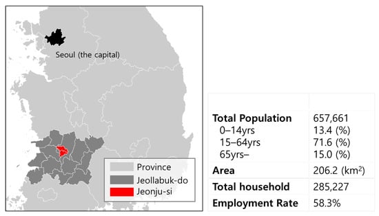 To examine urban vacancy patterns and their causes, we examined the case of Jeonju, located in the North Jeolla Province, South Korea (Figure 1). The extinction risk index was considered to measure the urban shrinkage. The index was first introduced to measure the urban shrinkage of Japan []. It is the value dividing the female population aged 20 to 39 years in a region by the population aged 65 years and above in the region. According to an analysis of trends in the local extinction risk index for 261 local governments across Korea, Jeonju was rated 0.67 as of 2020, which is quite low. However, as its risk has increased sharply since 2000, urgent measures need to be taken (see Table 1 for the extinction risk index). Lee [,] analyzed Korea’s local extinction and found that if the value is under 0.5, depopulation will continue to stagnate for over 20 years.