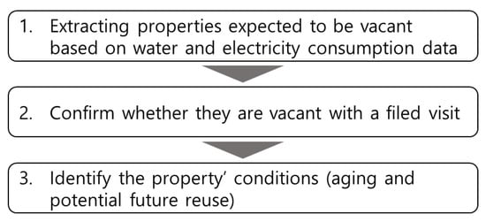 According to the “Act on Special Cases Concerning Unoccupied Houses or Small-scale Housing Improvement”, a vacant house is defined as a property that has been unoccupied for more than one year. Since it is difficult to keep track of properties that have been vacant for over one year, we identified the occupation status and building conditions of current housing. To obtain the vacancy data, the most accurate way to build data for vacant properties is to investigate the status of all buildings in the study area and determine whether they are vacant and how old they are. However, we surveyed the status of vacant properties to build a more effective data-limited budget using the following three steps (see Figure 2):
