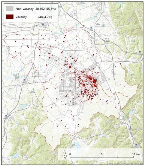 Based on the parcel numbering unit code for vacant properties derived from the above process, we established a building database along with building data from the geographic information system. The established building database includes various characteristics, including building identification number, parcel number, building structure, land area, gross floor area, violated building, building area, height, and construction year []. These data can be used to analyze contributors to vacant properties. From this process, a total of 52,429 parcels were extracted and spatialized out of 88,404 in Jeonju, excluding those that could not be analyzed (including illegal ones) as their characteristic data were not included in the building register. Since some multifamily properties share water and electricity usage, the survey has a limitation to determine whether a house is vacant within multifamily housing. Thus, 31,810 detached house parcels were re-extracted and used for analysis, and 4.2% of them (1348) were confirmed to be vacant (Table 2).