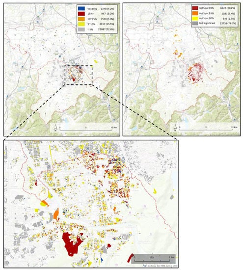 By investigating each house’s conditions, we included not only the local area’s socioeconomic characteristics but also the unique characteristics of individual buildings and access to infrastructure related to neighborhood environments as key explanatory variables. We employed a multilevel logistic regression model to identify parcels at high risk of vacancy in the future, instead of using past data to analyze trends and suggest policy alternatives. In addition to identifying parcels at high risk of vacancy, we identify high risk of vacancy clusters at the regional scale within the study area by examining their spatial distribution with hotspot analysis. Within this process, we present a reference to establish more realistic and future-oriented policies.