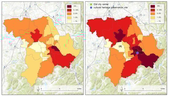 To empirically analyze the above findings, we used a hotspot analysis to confirm the spatial distribution of parcels with a vacancy probability of ≥5% and identified the probability of vacancy by Dong (Figure 5). The results showed that the vacancy rate is expected to increase in all 35 Dongs. Furthermore, it is expected that areas with high vacancy rates will face a vacancy threat in the future. More specifically, the probability of vacancy in Area (1), an old city center, is expected to be the highest (24.7%). Areas (2) and (3), adjacent to the old city center, where construction activities are limited to prevent loss or damage to cultural heritage and protect the landscape in the area designated as a cultural heritage preservation site, are expected to have a higher probability of vacancy (14.5%). In contrast, Area (4), where real estate development is the most active and new large-scale commercial zones are being formed, had better residential environments than other areas, and its probability of vacancy is less than 1% (Table 8).