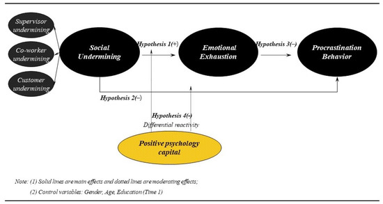 A study proved that social undermining is in a close relationship with negative behavior based on the social cognitive theory [22], arguing that learning takes place through interaction among personal factors, environmental events, and behaviors. Social undermining negatively affects individuals’ social relationships and their success [9] and refers to intentional behaviors to continuously impede individuals’ efforts to have positive interpersonal relationships and to develop a favorable reputation [4]. Sassali [23] defined emotional exhaustion as a state in which energy is exhausted due to the continuous frustration of individual desires. Montgomery et al. [24] defined emotional exhaustion as decreased job performance ability resulting from exhaustion of physical, emotional, and mental energy [25]. Procrastination behavior means procrastinating work for unnecessary and unreasonable purposes in a job situation [26]. PPC is an organizational member’s positive psychological state and considers an individual’s psychological state in a job situation, not their characteristic disposition [21]. In addition, we tried to verify if the negative impact of social undermining can be recovered through positive psychological capital through resource conservation theory [27,28,29]. In this study, we intended to explore the effects of social undermining on emotional exhaustion and procrastination behavior using these variables and examine the moderating role of PPC (Figure 1).