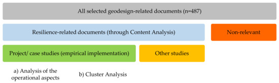 Using the list of terms developed, a content analysis [37] was performed on the key bibliographic texts of the selected geodesign documents. The texts under the title [38], abstract, and keywords of all selected 487 bibliographies were undertaken during the contents analysis. Appropriate content codes [37] were generated in NVivo by labelling and organising texts extracted from the developed contents that matched the identified “key resilience terms”. All documents analysed with either “resilience” citied or inclusive of any “what”, “why”, and “whose” of resilience (grounding questions) term(s) in their contents were categorised as resilience-related studies for detailed analysis (Figure 2). The operational questions: “where”, “when”, “how”, and “who” were explored by analysing the full texts of the resultant resilience-related studies. Here, particular attention was given to comprehend approaches to resilience planning adopted in the resilience-related projects/case studies detailing upon the technology tools (“how”) used and stakeholders (“who”) involved.