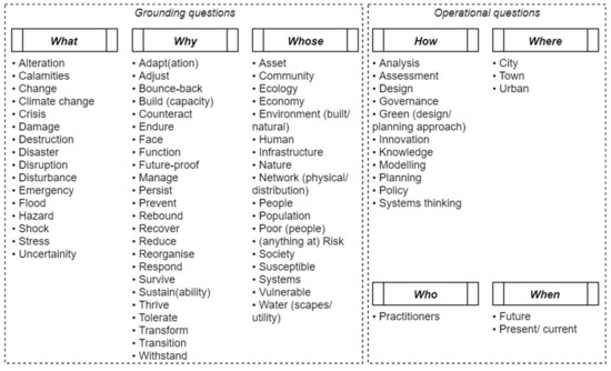 Furthermore, the following unique terms were found from the resilience definitions compiled by Merrow et al. [31], relating to the fundamental questions: “alteration” [42]; “sustainable and communities” [43]; “adjust” [44]; “build” (capacity), “face”, “governance”, and “uncertainty” [45]; “destruction” and “rebound” [46]; “tolerate”, “respond”, “reduce”, “counteract”, and “recover” [47]; “reorganise” [48]; “withstand” [49]; “practitioners”, and “innovation” [50]; “flood”, “damage”, “prevent”, and “maintain” [51]; “climate change”, “resist”, and “catastrophic” [16]; “disaster” and “town” [52]; “absorb” [53]; “avoid”, “hazard”, and “susceptibility” [54]; “asset” [55]; “calamities” [56]; “disruption” [57]; “population” and “endure” [58]; “social”, “economic”, “natural”, and “future-proof” [59]; “bounce-back” and “crisis” [60].