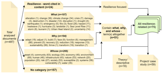The resultant categorisation excluded nearly one-third (n = 157) of all selected documents from further consideration (Figure 5). Here, only a fraction (n = 24) of the total analysed documents were resilience focused, having “resilience” citied in their contents. Another 51 documents, excluding those (n = 9) citing “resilience”, had any of all “what”, “why”, and “whose” of resilience related terms in their contents analysed. Therefore, a total of 75 documents (around 15%) were revealed as resilience-related studies during this analysis and were subjected to a full text reading (see Supplementary Materials for a list of the selected documents). Importantly, more than three-quarters (n = 59) of those resilience-related studies showcased geodesign-based projects/case studies, including academic dissertations (n = 6). The remaining were generally theoretical frameworks/perspectives/reviews (n = 13), and editorial (n = 3) documents.