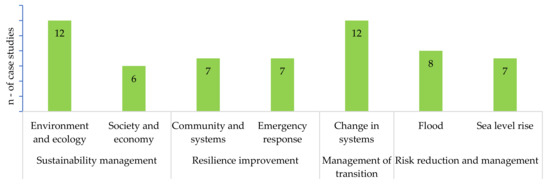 In answering the first research question of this research, the content coding results were examined with a further cluster analysis of the analysed case studies (n = 59). The coding result revealed a major focus of such case studies on accounting (“what”), local systems’ change, global climate change, and impending disasters such as floods and the rise in sea level. Sustainability thinking was a distinguished purpose (“why”) behind resilience improvement works found in the analysed case studies. Overall, in such case studies, the resilience of (“whose”) the environment, community, local systems, nature, and society were commonly pursued.