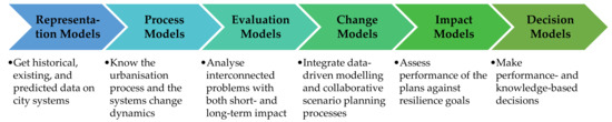 Interconnected city systems are coupled with deep and complex socio-ecological problems and risks [11] that resilience planning aims to minimise [12]. To make planning and policy decisions about such problems—often referred as “wicked” problems [13]—a diverse set of disciplines and perspectives is needed. A systems thinking approach is therefore recommended in resilience planning to improve a city’s overall adaptive capacity [12]. In that regard, numerous resilience planning frameworks have been formulated encompassing interconnected city systems such as social, environmental, ecological, economic, and infrastructure, see [9,14].