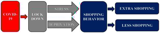 Thus, the general hypothesis of this study is summarized in the conceptual framework presented in Figure 1. The logical composition is the following: COVID-19 forced governments around the globe to introduce and deploy lockdown measures. In such conditions, people changed their daily activity and behavior which has formed stress and deprivation. It is obvious that this would have affected shopping behavior forming two alternative purchase patterns: extra shopping and less shopping.