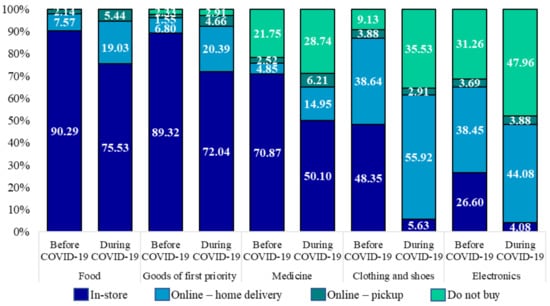 Within the second section, people were asked a list of questions for revealing purchase behaviors before and during the first wave of COVID-19. This study covers such commodities as food, medicine, the first priority goods (wipes, toilet paper, laundry detergent, and sanitizers), electronics, clothes, and shoes. At first, respondents had to point what purchase channel they used before and during the pandemic outbreak. The list of shopping channels is as follows: in-store, online—home delivery, online—pick up, or they could choose the option “do not buy this product”. Only one choice was available to reflect the preferable shopping channel for every product from the list. People were asked whether they will keep purchasing the goods after COVID-19 in the same way they already used to during the pandemic. It allowed us to reveal the changes in used shopping channels. Along with shopping channel choice, this information allows us to assess the level of changes in shopping behavior caused by the pandemic. Within the second section, the respondents were asked about transport modes used for in-store/online shopping before and during COVID-19. This section ends with the questions about shopping frequency and average purchase costs (in EUR) for two periods.