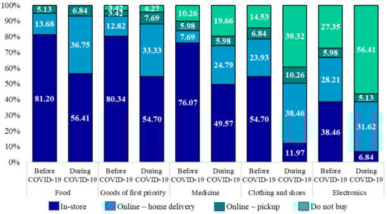 During polling, respondents were asked to assess preferences in purchase channels before and during the COVID-19 pandemic. The buying channels contained such options as in-store, online with home delivery, and online with pickup. Also, the respondent could point out some of the goods he/she did not purchase at all. That allowed us to evaluate how deep the pandemic affected end-consumers and their readiness to reject some goods. The results are presented in Figure 2 and Figure 3, accordingly for developed and developing countries, which correlate with the findings of Mishkin [42] and Romer [44], i.e., people significantly reduce the costs of durable goods during the crisis. Thus, this effect was detected for both types of economy, but it is more pronounced for the developing one. Figure 3 indicates that 56.41% of young adults from developing countries did not buy electronics, and 39.32% of them reflected the same attitude toward clothing and shoes during COVID-19. For developed countries, the reduction in purchase activity for durable goods is quite substantial—47.96 and 35.53%, accordingly, for electronics, clothing, and shoes. Given the polling was conducted for 3.5 months, which can be considered a short period for durable goods purchases, the above-made conclusion still stands. As spring is the period of sales, it is common for people to buy clothes and shoes to save money, especially for young adults. Nevertheless, during the survey period, we did not observe such behavior. This observation allows us to conclude money-saving behavior regarding durable goods.