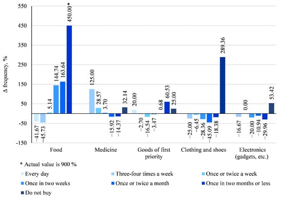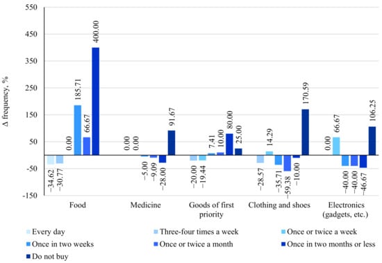 As we can see, 9.32% of respondents from developed countries have lost their jobs. This relatively high rate is complemented by the data on employment status change being evaluated at 14.95%. Thus, 24.27% of the young adults from developed countries have suffered due to income reduction or total loss. The picture for developing economy has some similarities, but with the softly negative impact of the pandemic. The reduction in personal income perceived 17.1% of respondents involved in the polling from developed countries. The changes in employment status affected people’s behavior, forcing them to reduce their expenditures according to the rational choice theory [83,84]. Sometimes, during a crisis, people’s behavior changes to addictive and panic manners, thus causing an extra shopping attitude [72]. Within this chapter, we propose to assess the availability of this behavior through the analysis of the purchase costs. The preliminary results show that the frequency of buying activity has been reduced (Figure 4 and Figure 5). In this case, if we determine the increase in shopping costs, it will reflect a rise in buying of amounts of goods. In turn, it will mean the presence of addictive or panic shapes of the purchase behavior. Table 4 contains the data on purchase costs before and during the COVID-19 lockdown for two economy types regarding a list of commodities.