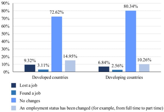In this study, we propose to assess the stability level of the young adults’ economic state through the changes in employment status. Due to lockdown orders, the business changed its activity with an appropriate complex of implementation of measures. Some of these measures dealt with the change of job activity by transformation into a remote working process. Nevertheless, in some cases, especially for the service industry, the pandemic COVID-19 has become a real challenge. Thus, since March 2020, only in the USA a significant closure rate shown in shopping and retail (27,663 closed businesses), restaurants (23,981 closed businesses), and beauty (15,348 closed businesses), according to data provided by Yelp Economic Average (updated 25 June 2020) [82]. The young adults being involved in these businesses could have lost their jobs with an appropriate increase in their perception of the crisis struggle. Polling allowed us to reveal this process and assess the changes in employment status caused by the COVID-19 lockdown. Figure 6 presents the analysis results in this field for two economies.