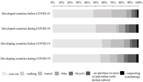 The pandemic crisis has negatively influenced mobility. The lockdown with a stay-at-home order, introduced in many developed and developing countries, substantially changed the mobility patterns with the mode choice option. In this study, we focused on assessing the mobility change in the case of in-store shopping trips. Figure 7 presents the specific weights for six alternative trip modes with additional conditions when the people do not attend the physical stores for shopping purposes. The trip patterns’ comparison before and during COVID-19 in developed countries allowed us to determine a significant reduction in public transit usage from 17 to 3% among the respondents. The people shifted to private cars (change in users’ number from 48 to 50%), walking (an increase from 21 to 24%), and biking (the slight increase from 6 to 7%). So, we observe the social distancing intentions with a shift on isolated trip modes. This finding supports the survey results by Molloy et al. [3], Pepe [86], Tirachini and Cats [87], reflecting the total decrease in trips made by people during the COVID-19 pandemic.