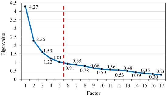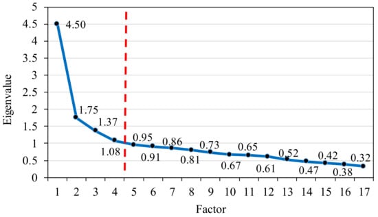 This chapter presents the factor analysis results to estimate the latent intentions and motivators for purchase behavior during the COVID-19 pandemic. The data for factor analysis were collected within the polling by 17 statements evaluation based on a five-point Likert scale. The factor analysis has been implemented with STATISTICA 7.0. Within the first step, we defined the eigenvalues for every one of 17 potential factors (presented in Figure 8 and Figure 9 for both economies). According to the Kaiser criterion [88], we excluded all factors from the analysis that had eigenvalues less than 1.0. These levels for developed and developing economies are indicated with red dash lines in Figure 8 and Figure 9. Varimax rotation was used to define the loadings and extract the factors. The lowest limit for the factor loading was fixed at 0.4. As a result, four and five factors were revealed, accordingly, for developed and developing economies. The variances explained by the factors for the developed economy are 4.255, 1.734, 1.386 and 1.325, accordingly, for four extracted factors. In turn, the developing economy’s factors have the following variances explained: 3.58, 2.065, 1.826, 1.529, 1.346. The factors’ loadings are shown in Table 5.