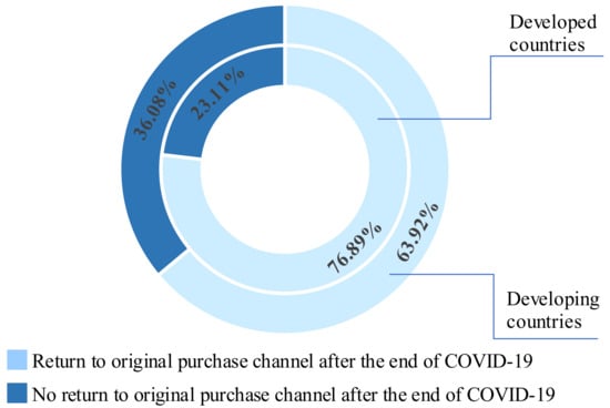 - According to polling, we evaluated the possible changes in young adults’ shopping behavior in post–COVID-19 time. Thus, Figure 10 reflects the percentage of adults’ readiness to return to pre-pandemic purchase channels. We can say that the intention to return to pre–COVID-19 purchase behavior is quite firm (76.89% of people want to use accustomed purchase channels). As for the developing economy, according to obtained results, we can state that the increase in online channel users can be characterized as a voluntary choice by young adults. It forms a massive opportunity for e-commerce deployment in post–COVID-19 time in developing countries. Thus, a raw 36% of young adults that shifted to online channel with home delivery options are ready to use this service in the post-pandemic time.