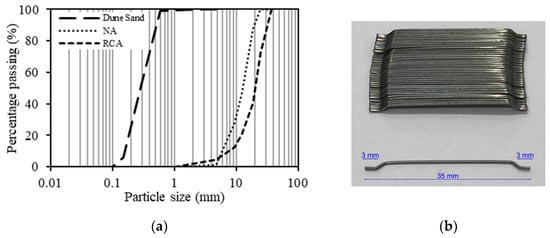 Materials: (a) Fine and coarse aggregates gradation curves of the (b) steel fibers.