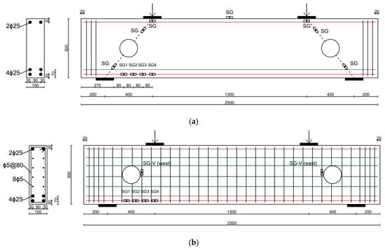 Details of deep beam specimens (dimensions are in mm): (a) A beam without conventional steel stirrups; (b) a beam with conventional steel stirrups.