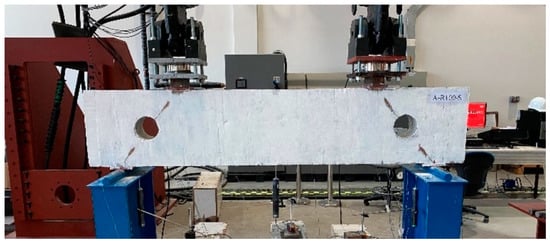 The test setup is shown in Figure 3. All beams were tested to failure under two concentrated loads using two actuators. The effective span of the beams was 2100 mm, and the shear span was 400 mm. The distance between the concentrated loads was 1300 mm. Two load cells were used to record the applied loads. In addition, 20 × 150 mm (thickness × width) steel bearing plates were placed under the loading points and at the supports. The tests were initially performed under a load-controlled rate of 0.5 kN/s. When the beam reached approximately 80% of its anticipated shear capacity, the loading method was changed to be displacement-controlled at a rate of 0.6 mm/min in an effort to avoid a catastrophic collapse and to capture the post-peak response. The midspan deflection was measured using a linear variable differential transducer (LVDT). The strains in the tension steel within the shear span were measured using four strain gauges (SGs), each having a length of 5 mm. These SGs were bonded to the bottom longitudinal steel reinforcement at a spacing of 80 mm within the shear span. In each shear span of the beams with steel stirrups, a 5-mm SG was installed on the vertical stirrup next to the opening. The locations of the SGs bonded to the tension steel and stirrups are illustrated in Figure 2b. The longitudinal concrete strains were measured using three SGs of 60 mm length bonded to the concrete surface longitudinally at the midspan and under the load plates. Four SGs of 60 mm length were also bonded to the concrete surface in the diagonal direction in the top and bottom chords of each shear span to measure the concrete strain in the diagonal direction in each chord. The locations of the concrete SGs used in all deep beams are shown in Figure 2a. The measuring tools were connected to a data logger to record the readings simultaneously. The development and propagation of cracks were marked, and the mode of failure was recorded. Digital image correlation (DIC) technique may be used in future research or field applications as an alternative to mechanical measurement devices to facilitate monitoring of surface strains and development of cracks in critical regions of concrete beams with web openings [45,46].