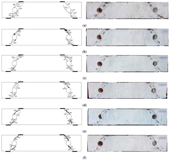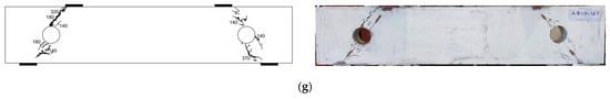 Figure 5a–g show the crack patterns observed in the tested deep beam specimens at failure. All specimens failed in shear. In specimen AR0-SF0, diagonal tension cracks developed in the bottom chords and then progressed tangentially to the inner side of the openings, crossing in the top chord toward the load points after further incremental loading. At approximately 75% of the load capacity, another diagonal crack developed in the top chord in both shear spans. At the time of failure, two independent diagonal splitting cracks formed in the top and bottom chords of the west shear span causing a frame-type mode of failure (Figure 5a). Specimen AR100-SF0 initially exhibited diagonal tension cracks crossing the center of the openings in the top and bottom chords of the shear spans (Figure 5c). These cracks stopped propagating after a small advancement in the load and did not cause failure. After further increase in the load, the beam failed in a frame-type mode of failure due to development of two diagonal splitting cracks independently in the top and bottom chords of the shear spans causing failure (Figure 5c).