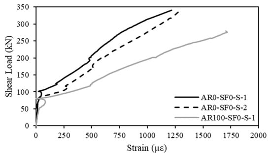Figure 6 shows the shear load-stirrup strain relationship. The SG in one of the vertical stirrups of beam AR100-SF0-S malfunctioned during testing. All the measured strain in the vertical stirrups were below yielding. The stirrup strain response included two stages, namely, pre-cracking and post-cracking stages. Initially, the steel stirrups showed no or minimal strains. Following cracking, the stirrup strain increased in a linear fashion until failure. The rate of increase of the stirrup strain of the two vertical stirrups of beam AR0-SF0-S was insignificantly different. The stirrup strain increased at a higher rate in beam AR100-SF0-S with 100% RCAs compared to that of AR0-SF0-S with NAs. The higher rate of increase of stirrup strain in the case on RCA-based beam signifies a reduced contribution of the recycled aggregates concrete to the shear resistance compared to that of the NA-based counterpart. The reduced contribution of RCA-based concrete to the shear resistance can be ascribed to its inferior properties relative to those of NA-based concrete.
